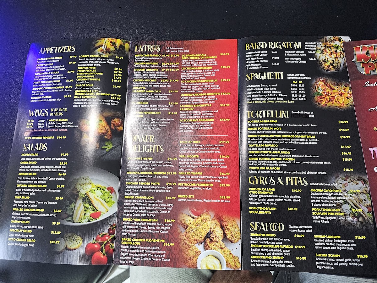 As a reviewer wrapping up my experience with the menu at Kickin Pizza in Radcliff, I find it impressively diverse and comforting, offering something for nearly every craving. The menu blends Italian-American classics with Greek-inspired dishes, making it ideal for both families and groups with varied tastes. From hearty pasta dishes like Baked Chicken Florentine Cannelloni, Baked Veal Parmesan, Lg Lasagna, and Fettuccine Alfredo, to lighter yet flavorful options such as Chicken Stir-Fry or Shrimp Linguine, the dinner selections feel satisfying and well-rounded. The spaghetti section stands out for its flexibility, allowing diners to choose combinations like Spaghetti With Meatballs & Choice Of Sauce or keep it simple with Spaghetti With Marinara Sauce, No Meat.