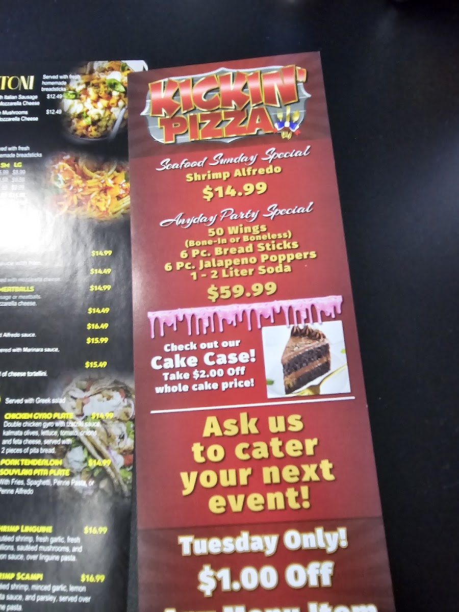 To round things out, starters like Fried Zucchini Sticks, Jalapeño Cheddar Poppers, and shareable Wings options make the menu feel complete. Overall, Kickin Pizza’s menu successfully brings together comfort, variety, and familiarity, leaving a strong final impression of a neighborhood spot that truly caters to many tastes.